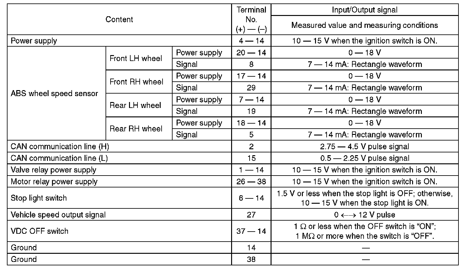 ^ When the connector is removed from the VDCCM&H/U, the brake warning light (EBD warning light), ABS warning light, VDC warning light & VDC indicator light, VDC OFF indicator light, and the hill start assist warning light illuminate.