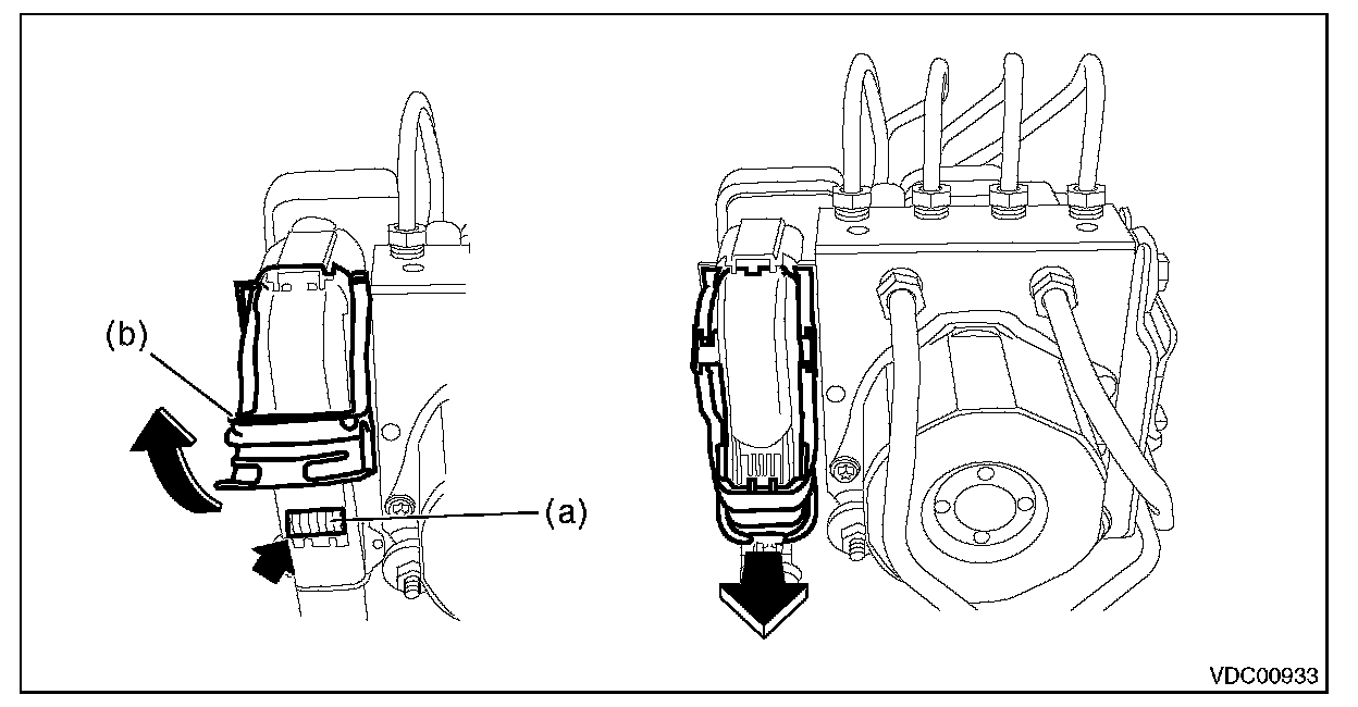 (2) Pull up the lock lever (b) while pressing the lock button (a) and disconnect the VDCCM&H/U connector.