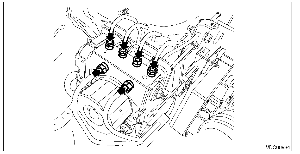 (3) Using a flare nut wrench, disconnect each brake pipe from VDCCM&H/U.