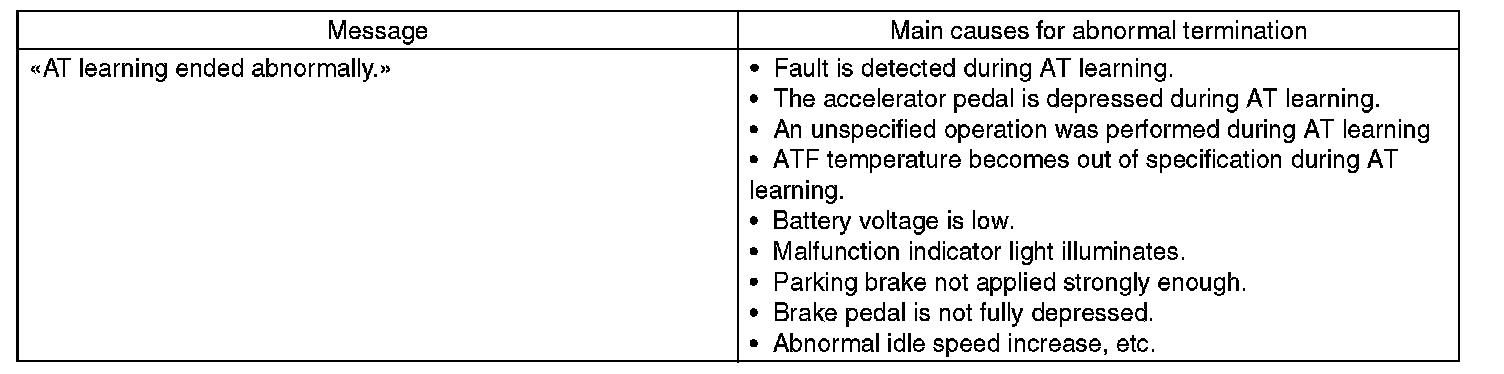 During AT learning in progress, AT OIL TEMP light in the combination meter starts flashing at 2 Hz and the learning operation starts. The following message is displayed on the screen when the AT OIL TEMP light which was flashing at 2 Hz turns off.