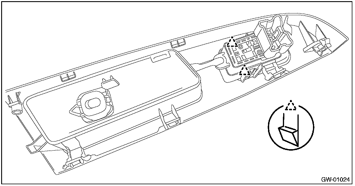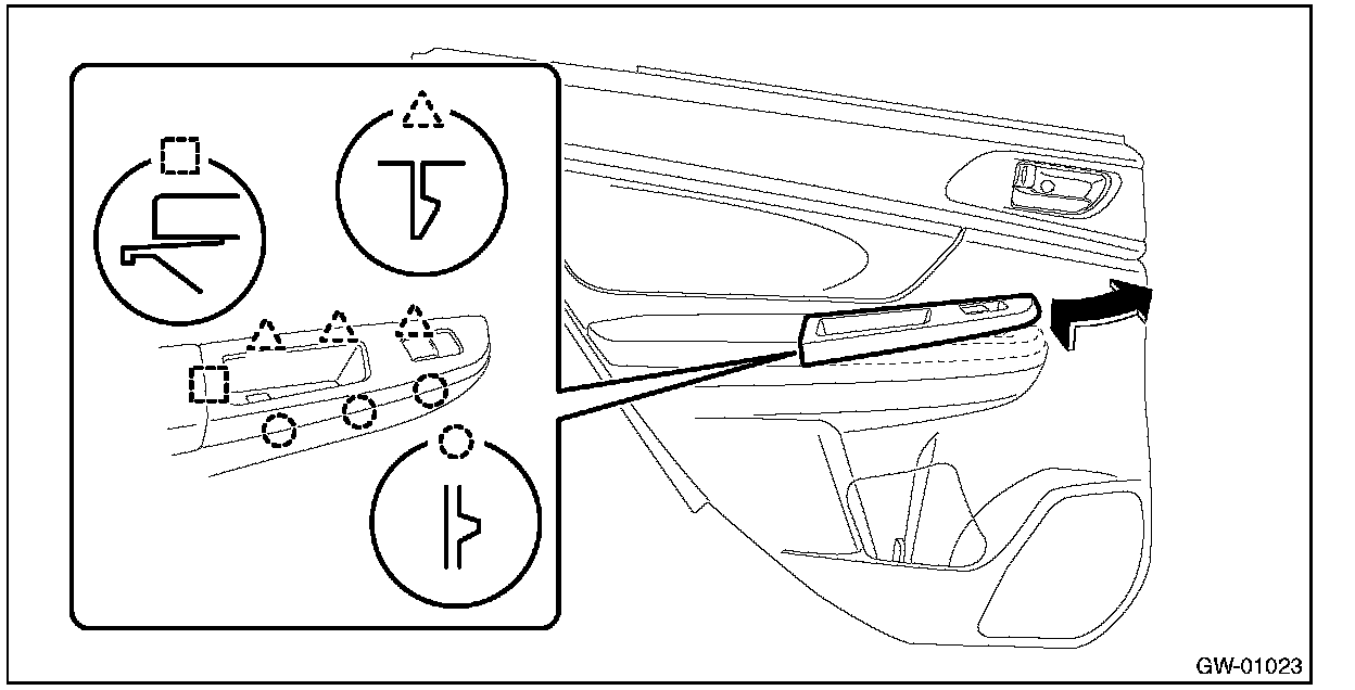 CAUTION: Be careful not to damage the trim panel - rear door with the panel - power window sub switch rear.