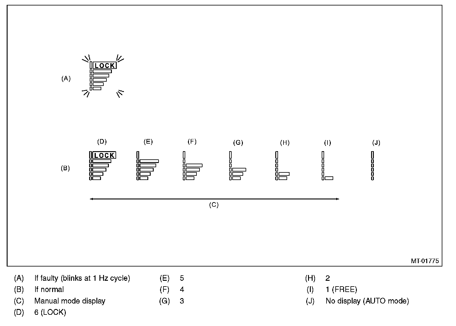 When there is a problem with a part or module, DCCD manual mode display blinks. (DCCD manual mode display blinks even in AUTO mode condition.) The blinking starts from when the problem is detected, and continues until the ignition switch is turned OFF. The faulty parts can be recognized by reading DTC with the Subaru Select Monitor.