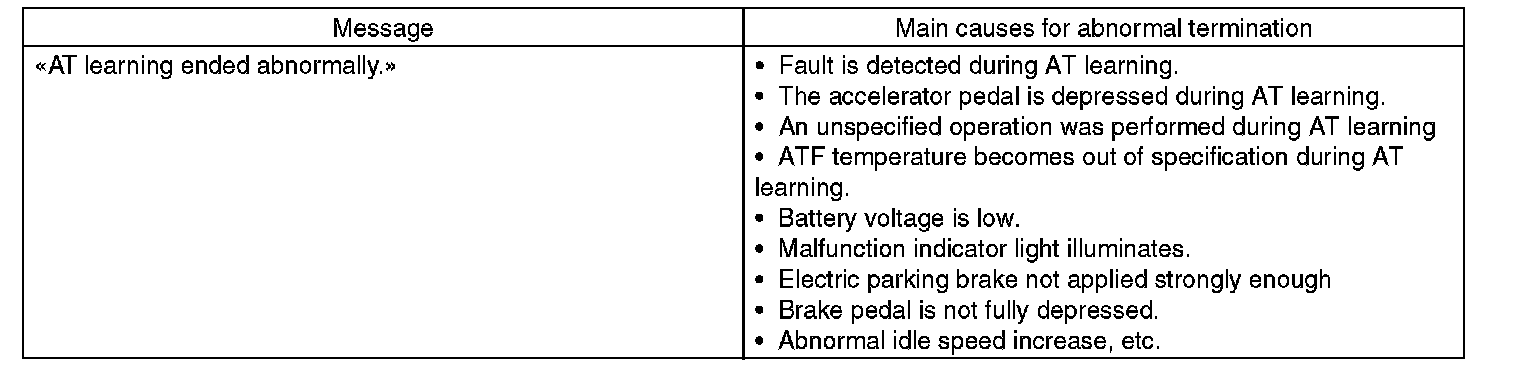 During AT learning in progress, AT OIL TEMP light in the combination meter starts flashing at 2 Hz and the learning operation starts. The following message is displayed on the screen when the AT OIL TEMP light which was flashing at 2 Hz turns off.