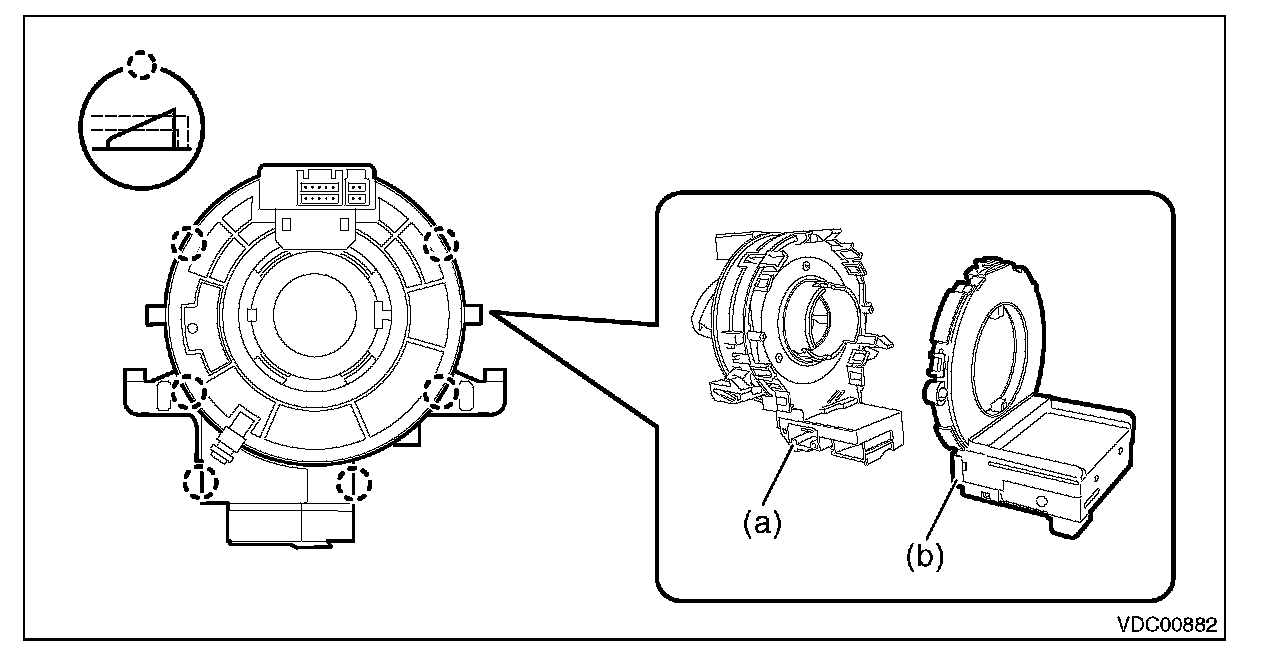 (1) Release the claws and remove the steering angle sensor (b) from the roll connector (a).