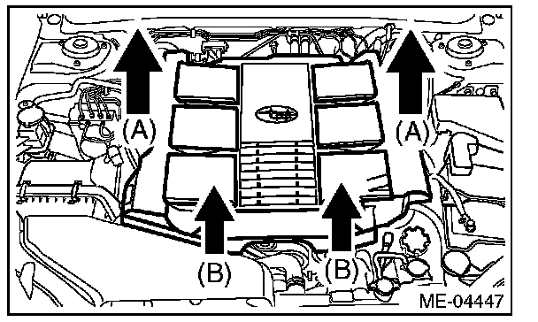 (2) Lift up the front side holding two positions (B) while moving it in the forward direction of the vehicle.