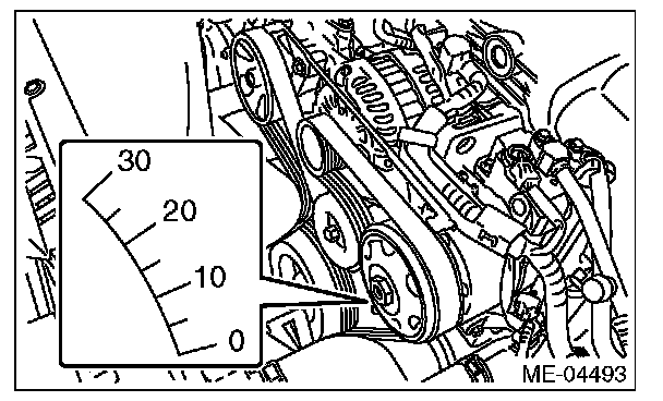 12) Start the engine, turn the timing light to the crank pulley, and check the ignition timing through the chain cover gauge.
