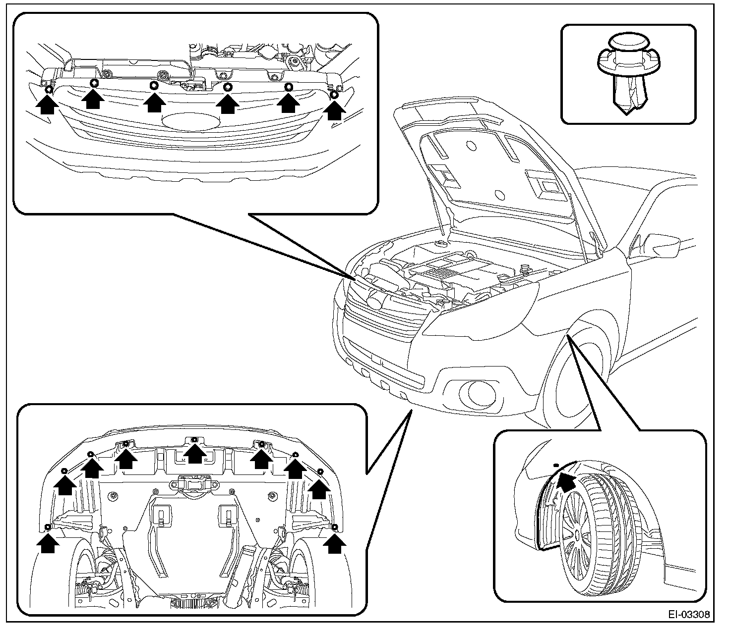 1. Remove the clips and turn over the front end of front mud guard. (Model with fog light)