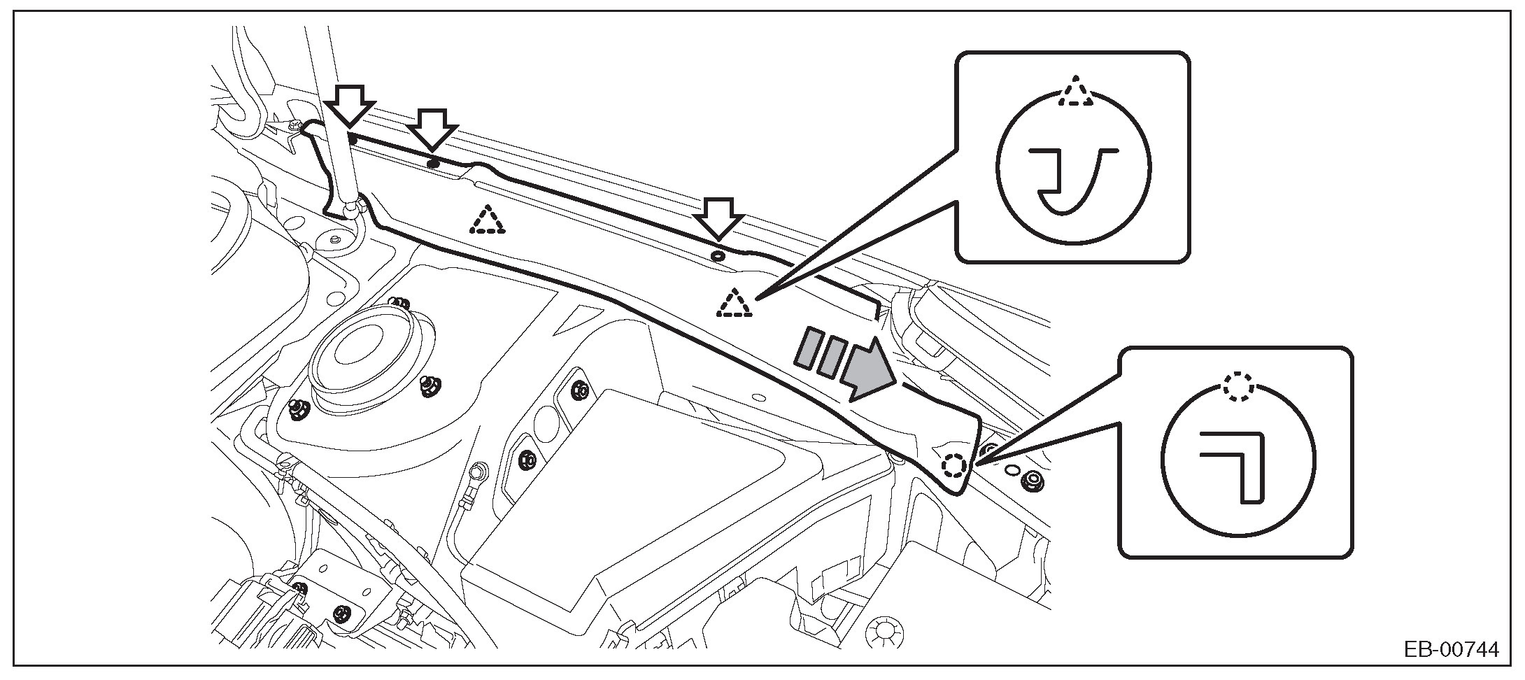 2. Remove the cowl panel side from inside the fender panel by pulling it.