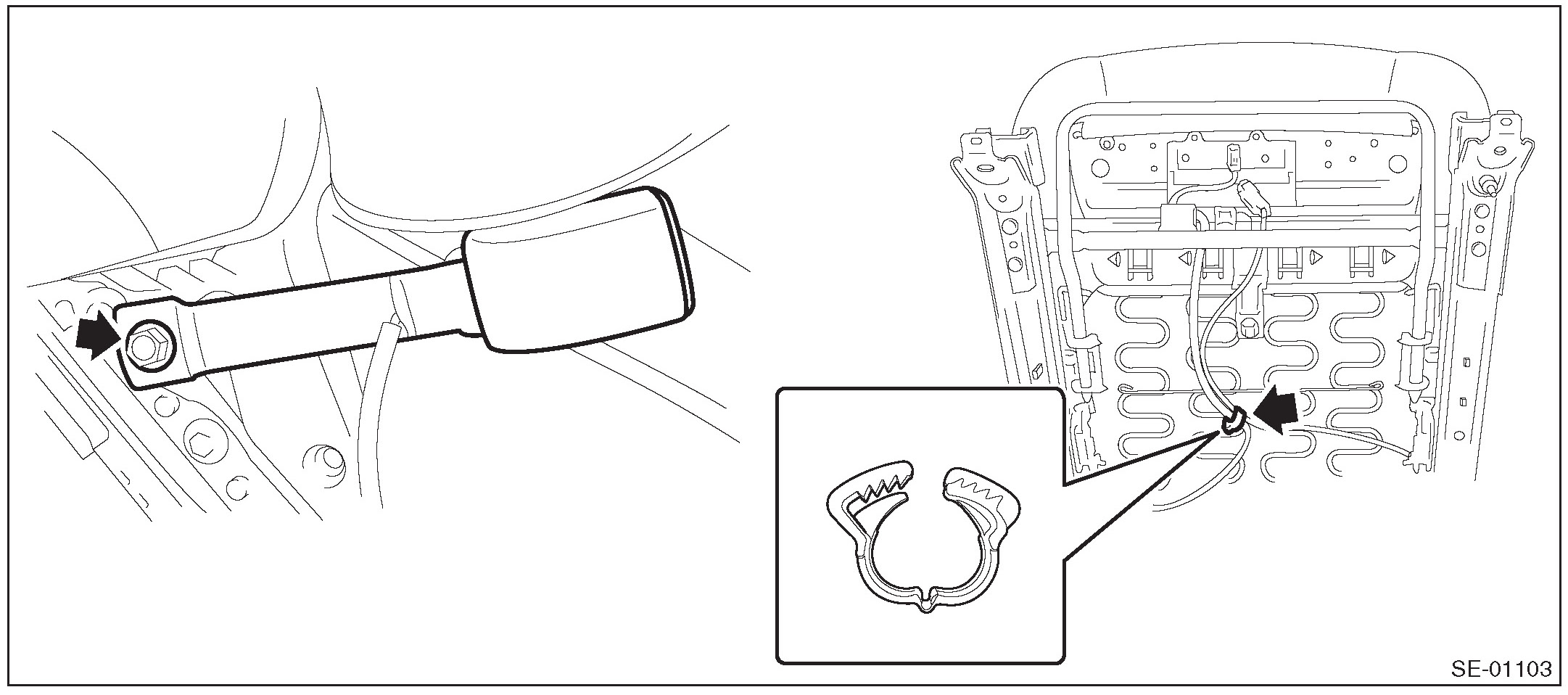 1. Remove the clip for the side airbag harness located under the seat cushion. (seat with side airbag)