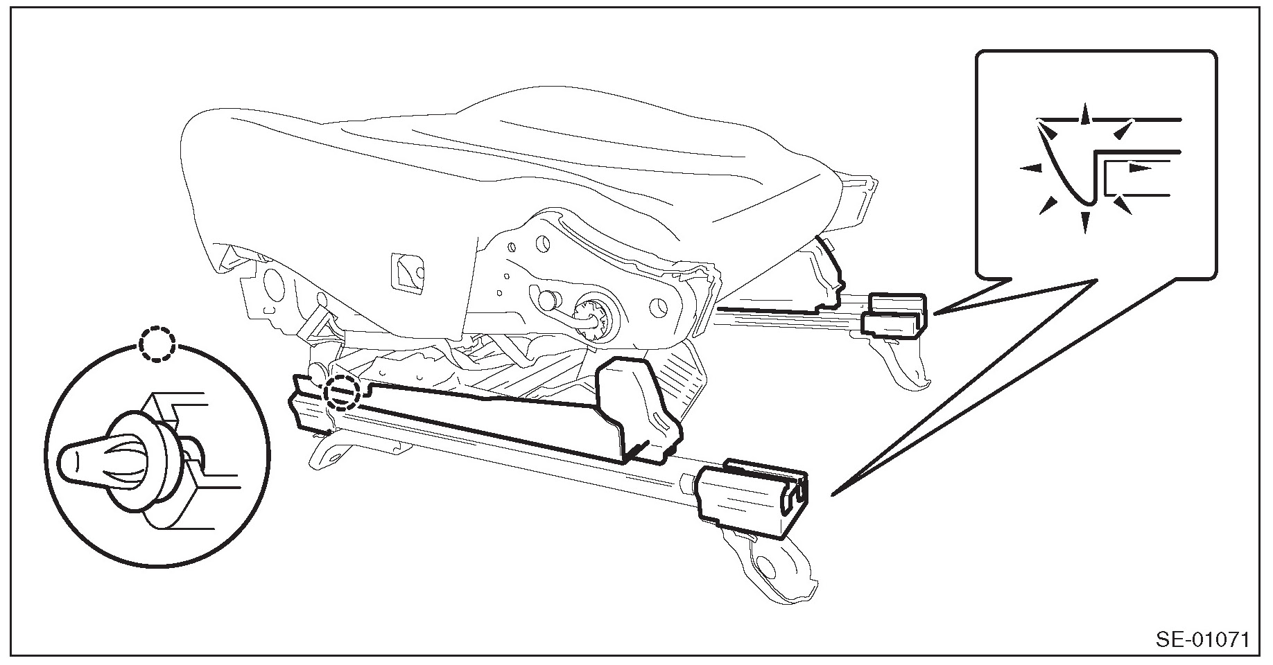 - The slide rail mounting bolts for the manual seat are coated with the thread lock material. Therefore, do not reuse the removed bolts. Always use new bolts during assembly.