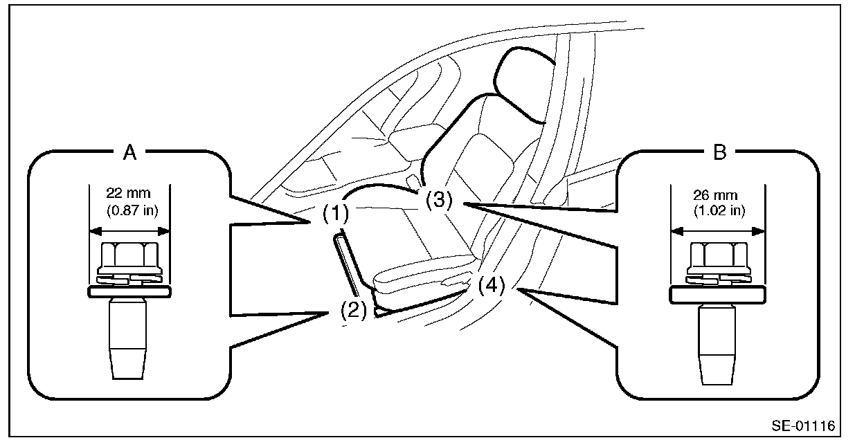 - Rear (bolt B): Washer diameter 26 mm (1.02 in)
