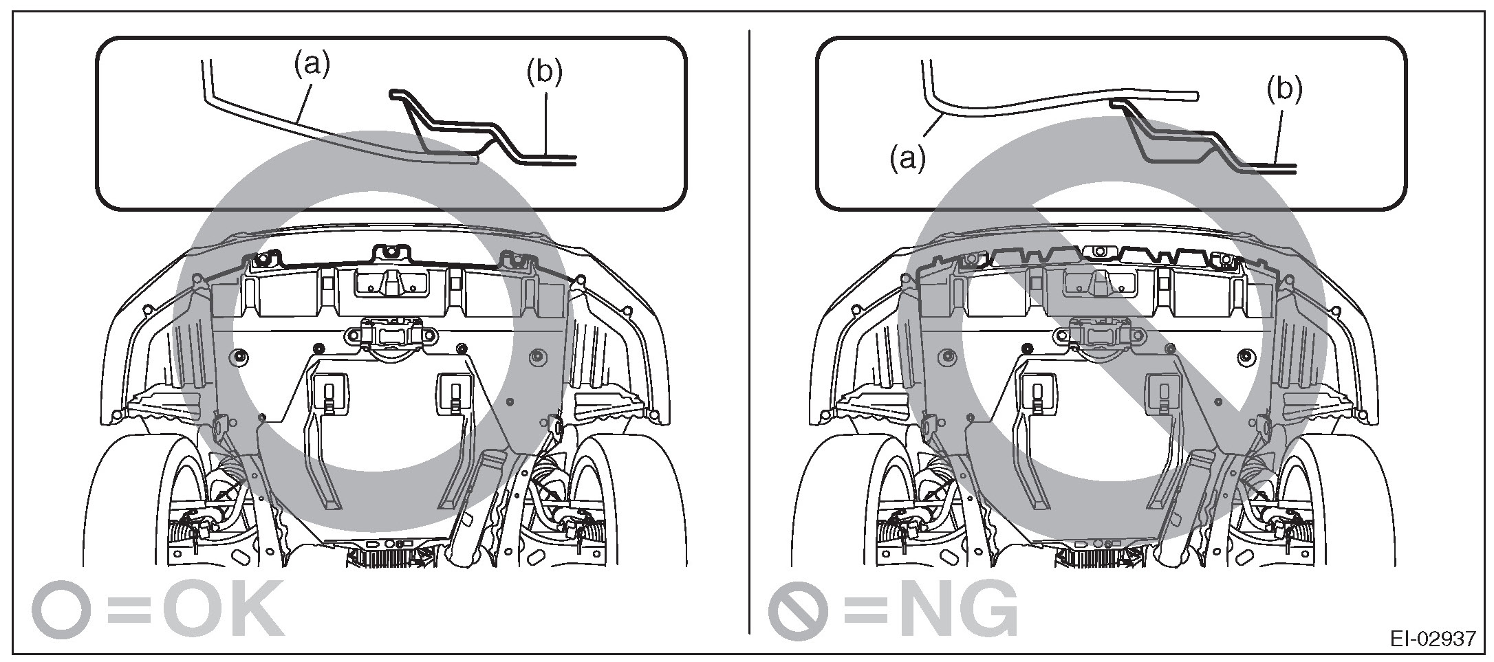 CAUTION: Install the under cover so that the under cover front end (b) comes inside of the front bumper face (a).