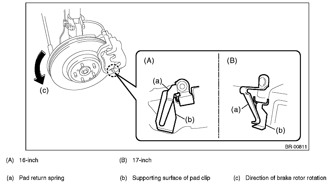 ^ Correctly install the pad return spring to the supporting surface of the pad clip as shown in the figure.
