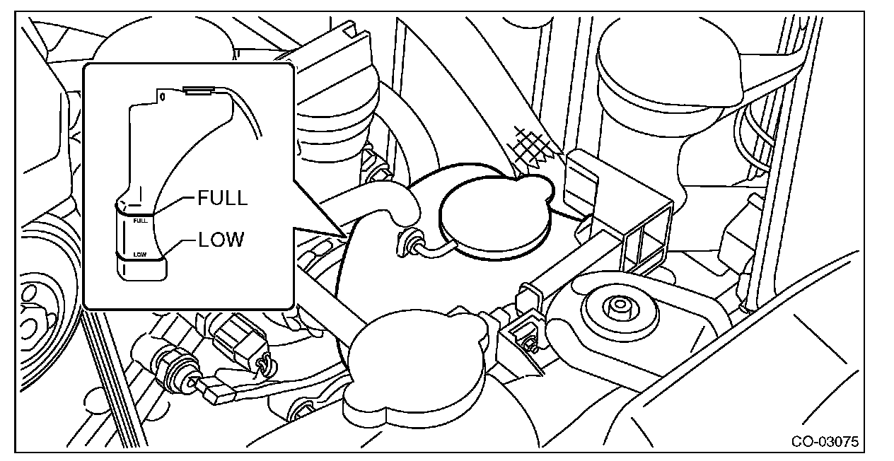 3) Fill engine coolant into the reservoir tank up to "FULL" level.