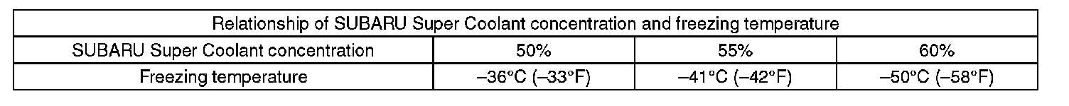 Use the SUBARU Super Coolant with a 50 - 60% concentration in order to obtain maximum antifreeze and anti-rust performance.