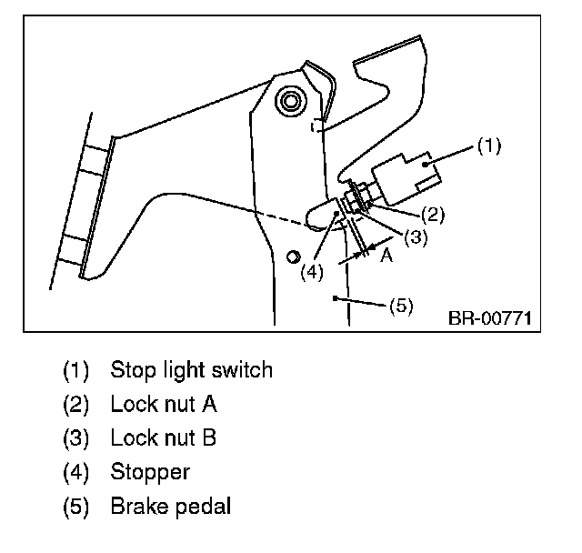 1) Loosen the lock nut, and adjust the stop light switch position until the clearance (A) between the threaded end of the stop light switch and stopper becomes 0.8 mm (0.031 in). Then, tighten the lock nut.