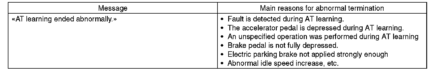 For the messages "SHIFT control system learning in progress" and "AWD control system learning in progress", AT OIL TEMP light in the combination meter blinks at a cycle of 2 Hz before learning operation starts. When AT OIL TEMP light in the combination meter goes off, the following message is displayed on the screen. When operation ends abnormally during the learning, AT OIL TEMP light blinks at a cycle of 4 Hz.