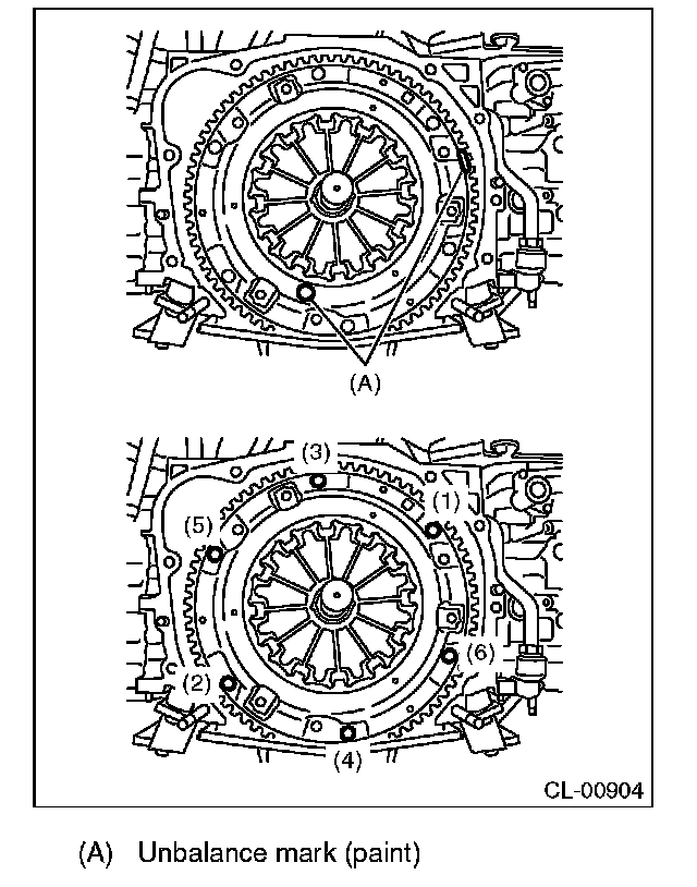 ^ When installing a clutch cover to the flywheel, position the clutch cover so that the spacing between the unbalance marks (paint mark) on the flywheel and clutch cover is 120° or more apart. (The unbalance mark indicates the direction of residual unbalance.)