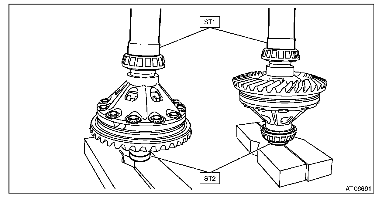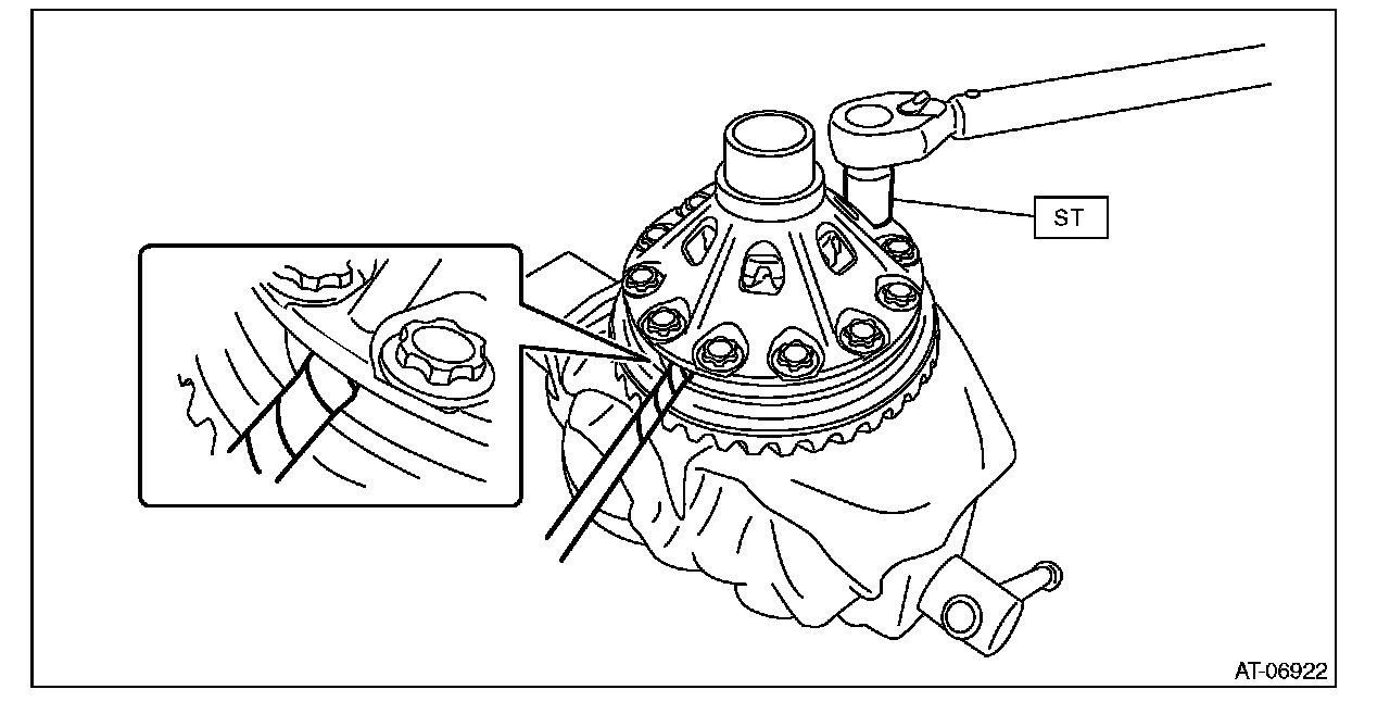 7) Using the ST, install the hypoid driven gear by tightening the installation bolt.