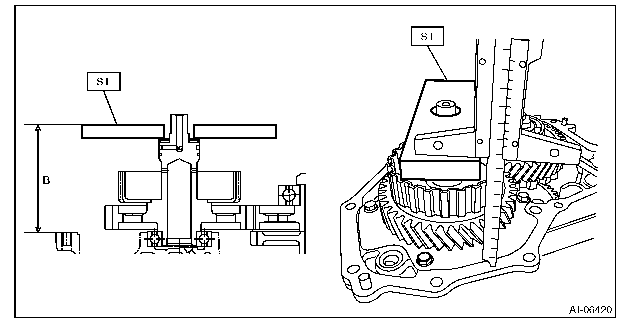 4) Using the ST, measure the height "B" from the transmission case mating surface to the end of ST.