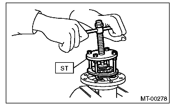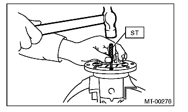 3) Align the pinion shaft and differential case with each hole, and drive the straight pin into the holes from the hypoid driven gear side using the ST.
