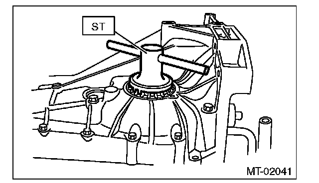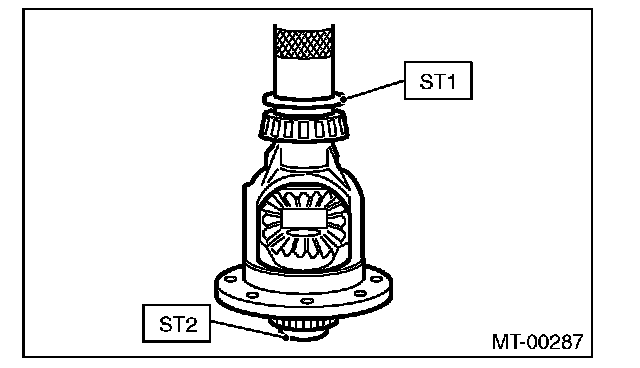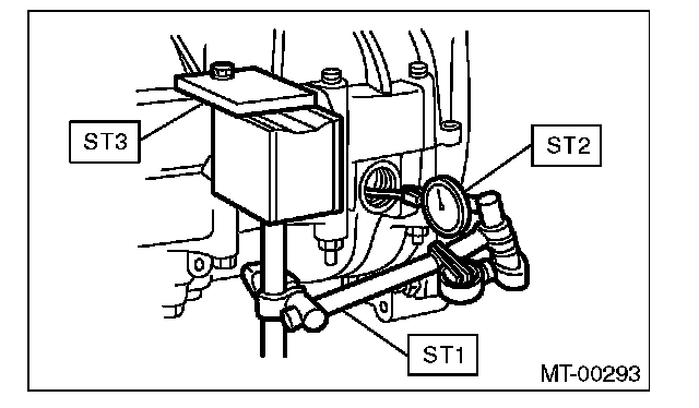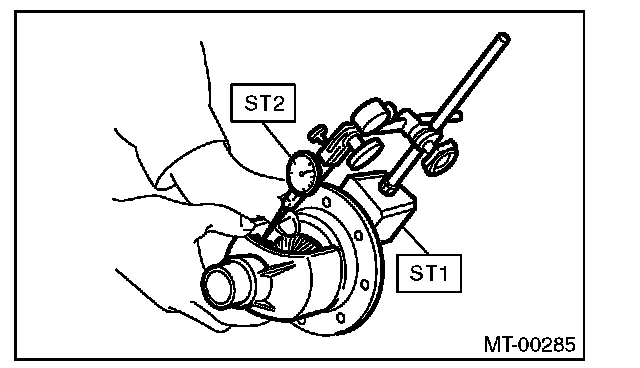 1) Set the ST1, ST2 and ST3. Insert the dial gauge probe through drain plug hole so that the probe comes in contact with the tooth surface on the right corner, and check the backlash.