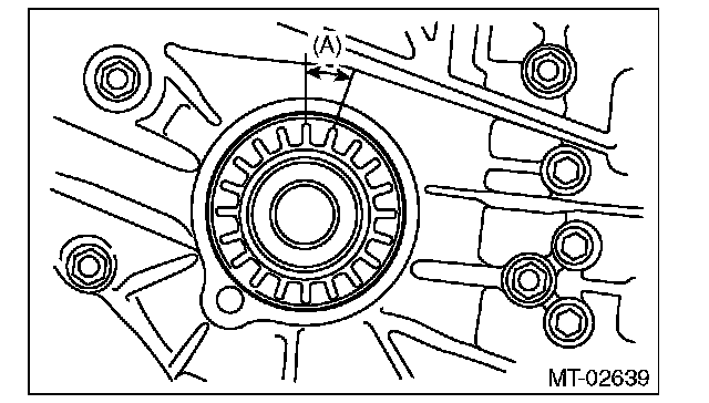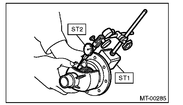 2) Install SUBARU genuine axle shafts to both sides, rotate in the inversion direction so that the gauge contacts the tooth surface, and read the dial gauge.