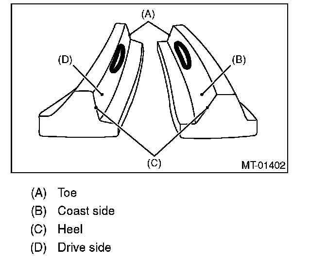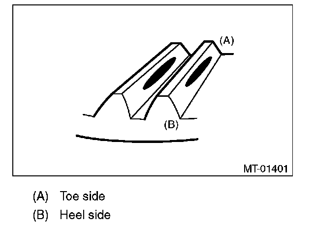 Check item: Tooth contact surface is slightly shifted toward the toe side under a no-load condition. (When driving, it moves towards the heel side.)