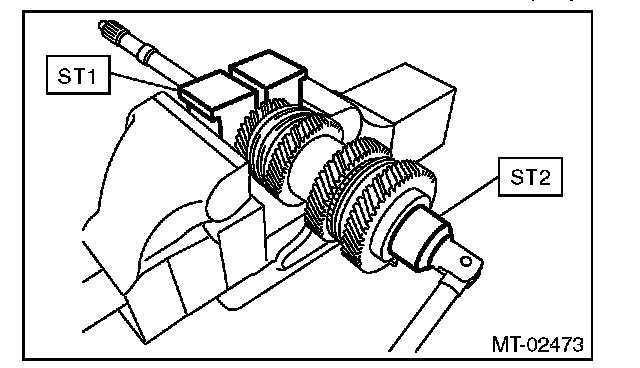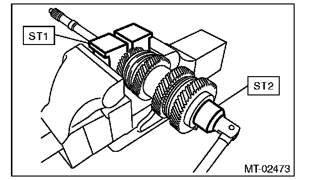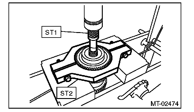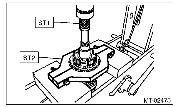 7) Install the double taper roller bearing into the rear section of transmission main shaft using ST1, ST2 and a press.