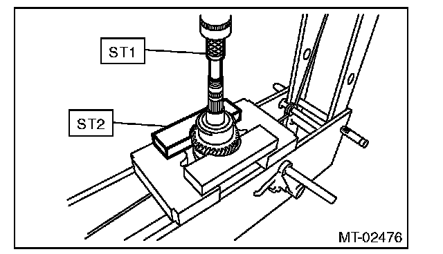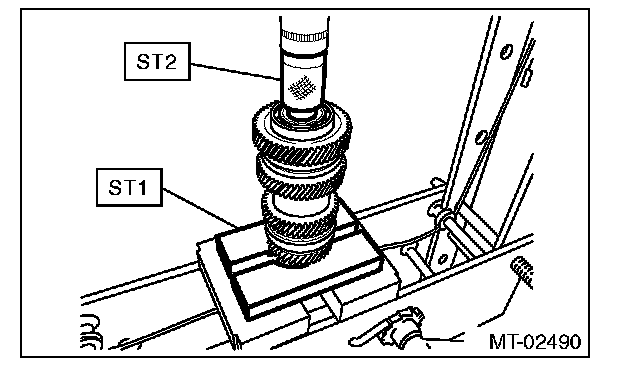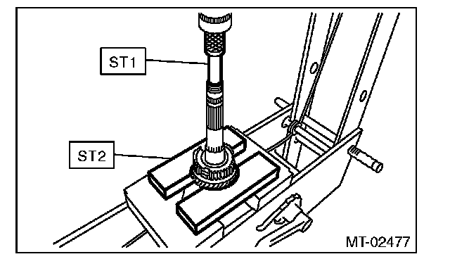 6) Remove the 5th drive gear, 6th needle bearing race, 5th baulk ring, 5th-6th synchronizer hub and needle bearing using the ST1, ST2 and a press.