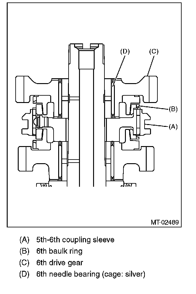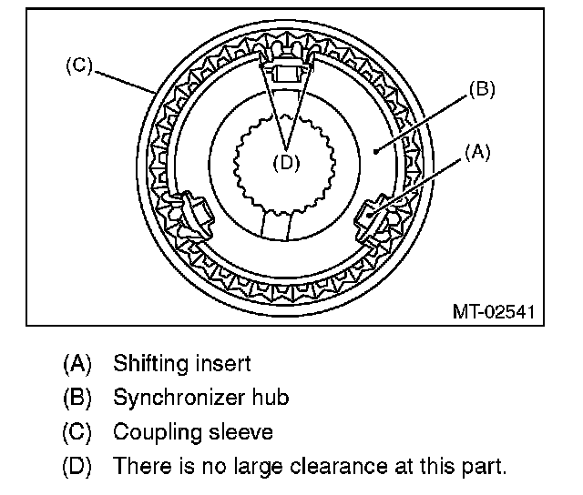 ^ Do not disassemble the coupling sleeve & synchronizer hub; the engaging point is pre-determined. If it is necessary to disassemble, mark the engaging points on the splines beforehand.