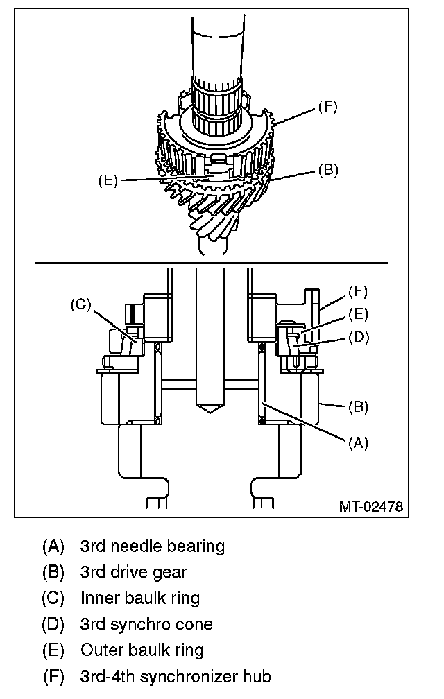 2) Install the needle bearing, 3rd drive gear, outer baulk ring, 3rd synchro cone, inner baulk ring and 3rd-4th synchronizer hub on the transmission main shaft.