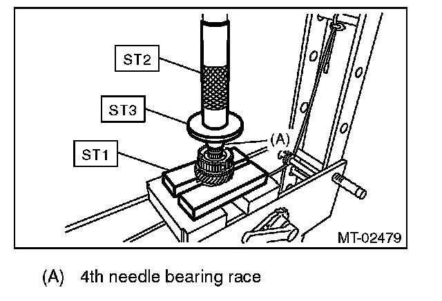 3) Install the 4th needle bearing race onto transmission main shaft using ST1, ST2, ST3 and a press.