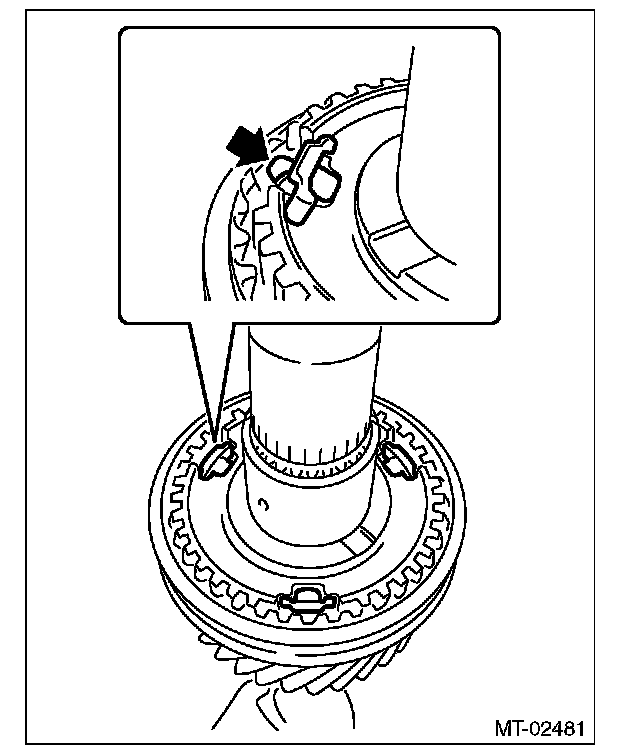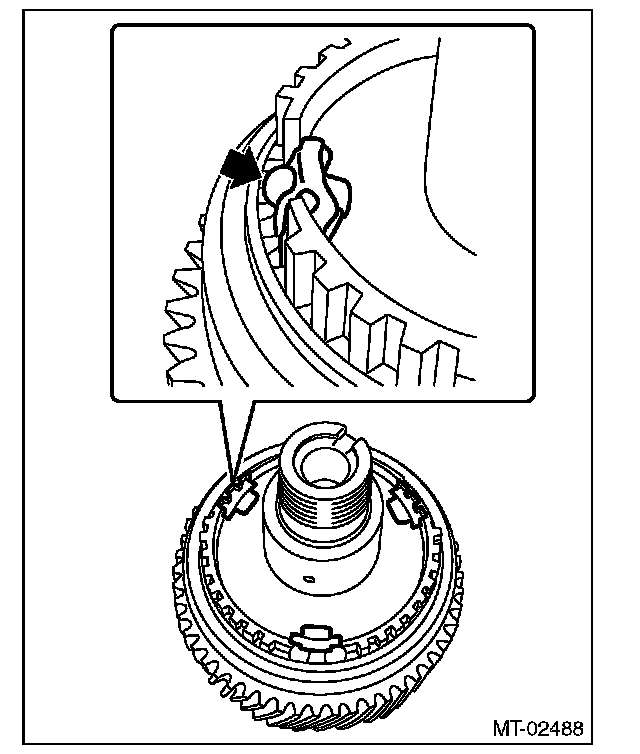 ^ Align the protrusion of the outer baulk ring into the groove of the 3rd-4th synchronizer hub.