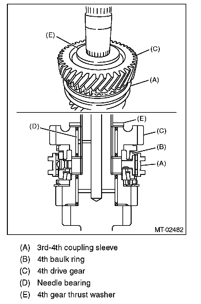 6) Install the 4th baulk ring, needle bearing, 4th drive gear and 4th gear thrust washer to the transmission main shaft.