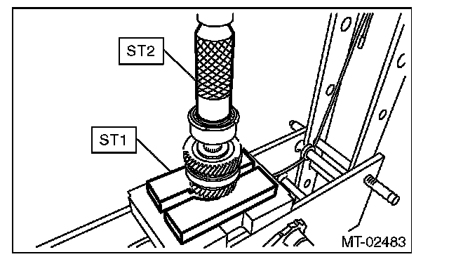 10) Remove the 3rd drive gear, 4th needle bearing race, 3rd-4th synchronizer hub, inner baulk ring, 3rd synchro cone, outer baulk ring and needle bearing using the ST1, ST2 and a press.
