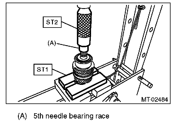 9) Install the 5th needle bearing race onto the transmission main shaft using ST1, ST2 and a press.