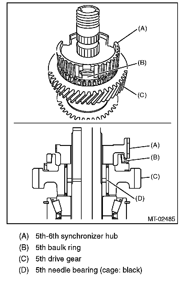 10) Install the needle bearing, 5th drive gear, 5th baulk ring, and 5th-6th synchronizer hub on the transmission main shaft.