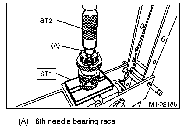 11) Install the 6th needle bearing race onto the transmission main shaft using ST1, ST2 and a press.