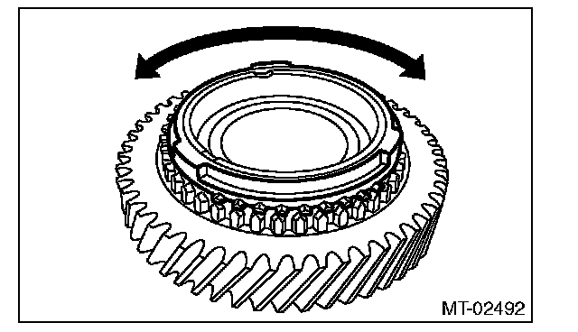 ^ Apply gear oil to the cone of the gear and while press-fitting the synchronizer ring, check there is no rotation in the circumferential direction.