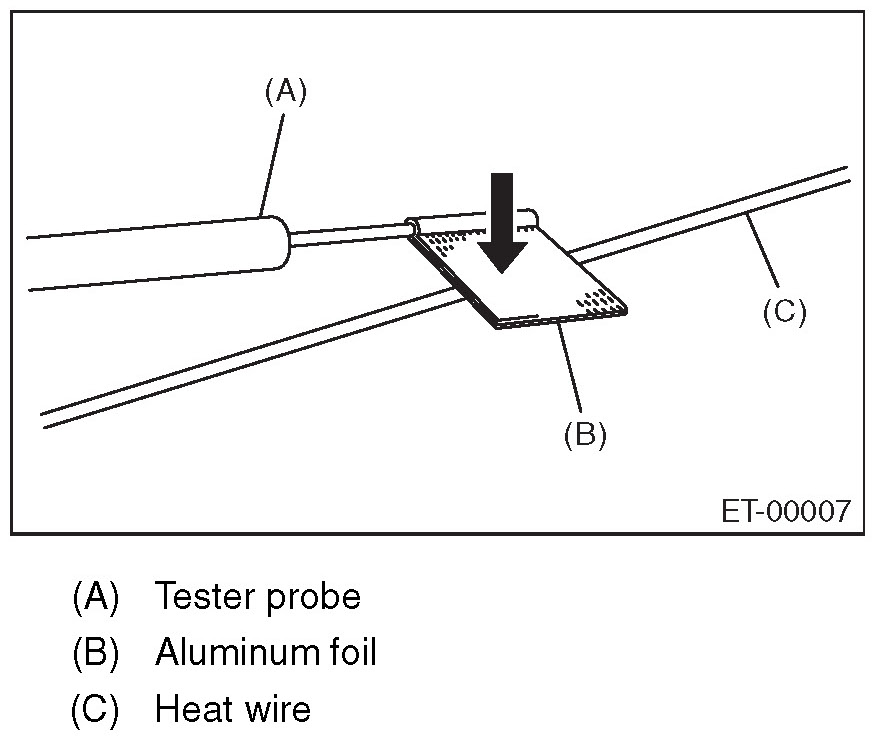 8. Move the tester probe on the negative (-) side slowly along the heat wire. If voltage changes from zero while moving the tester probe, heat wire is open at the voltage change point.