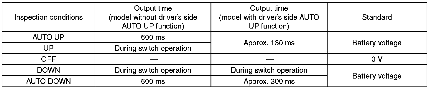 NOTE: Since output time during window UP operation is extremely short, it cannot be checked without using a measuring instrument such as oscilloscope. Output is constantly produced while the switch is operated for window DOWN operation.