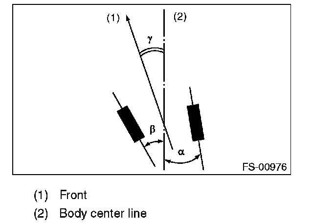 Thrust angle is a mean value of left and right wheel toe angles in relation to the vehicle body center line. Vehicle is driven straight in the thrust angle direction while slanting in the oblique direction depending on the degree of the mean thrust angle.
