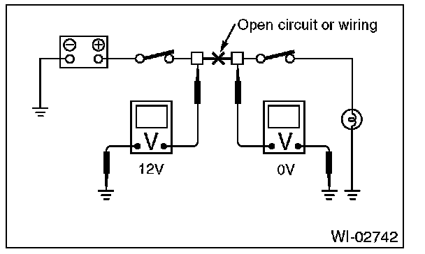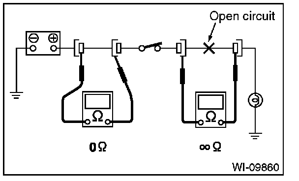 Disconnect all connectors affected, and check continuity in the wiring between adjacent connectors. When the ohmmeter indicates "infinite", the wiring is open.