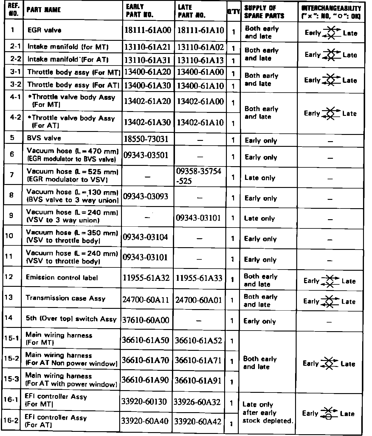 This bulletin is to inform you that as of October 1988 production, there has been a modification to the EGR control system for Califomia specification Sidekicks. The early California specification features two EGR system circuits; one through a main EGR valve and the other through a sub EGR valve. This system was modified to an EGR control system that is virtually the same as that used in