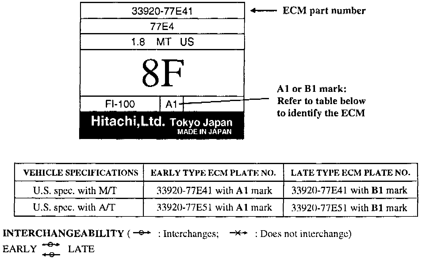 This bulletin is to inform you of the modification of the ECM (Engine Control Module) which has been carried out since November 1995 production. The LATE type ECM has been modified to activate the fuel pump for three (3) seconds when the key is initially turned to the "ON" position. When ordering a new ECM for this vehicle, please use the information contained in this bulletin.