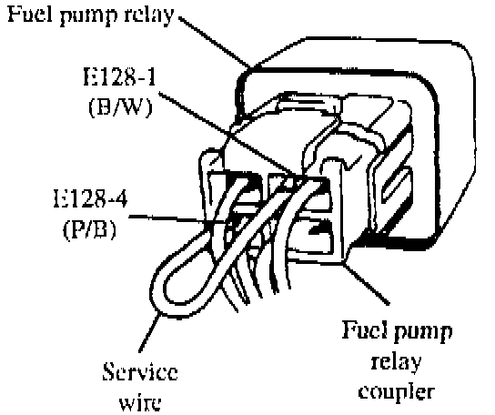 The fuel pump on vehicles with the EARLY type ECM will not operate when the engine is not running and the ignition switch is in the "ON" position. To activate the fuel pump with the EARLY style ECM without cranking the engine, insert a jumper wire into terminals E128-4 (P/B wire) and E128-1 (B/W wire) of the fuel pump relay coupler.
