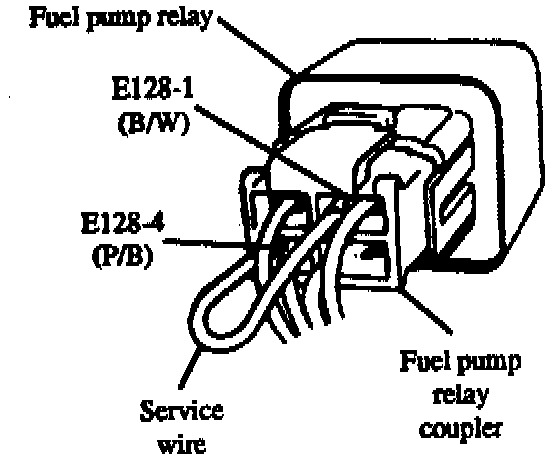 The fuel pump on vehicles equipped with both EARLY type and A1 style LATE type ECM's will not operate the fuel pump when the engine is not running and the ignition switch is turned to the "ON" position. To activate the fuel pump without cranking or starting the engine, insert a jumper wire into terminals E128A (P/B wire) and E128-1 (B/W wire) of the fuel pump relay coupler.