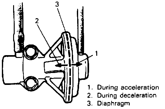 5. Warm up engine to normal operating temperature and race it after warming up. Then check to be sure that diaphragm moves toward I in figure at the left during acceleration and toward 2 during deceleration.
