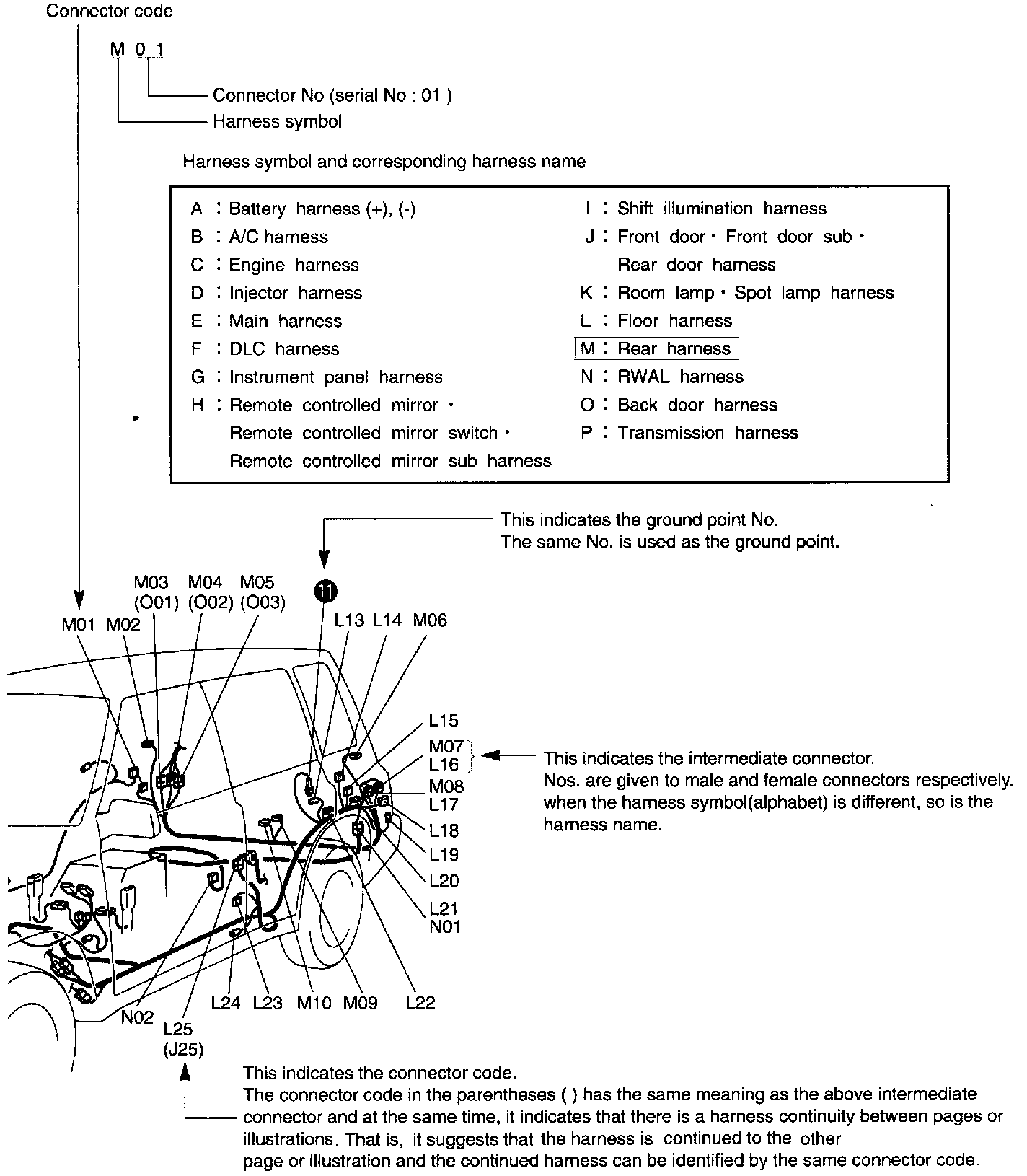 Each connector is identified by the code consisting of the harness symbol and the connector serial number as shown in the image. As each code is assigned to each connector in the System Circuit Diagram, it is easily possible to retrieve where the connector in question is located by using its code. To locate the connectors, all you have to do is to look for the same code in the Connector Layout Diagram. Refer to the next image for more information on use of the code.
